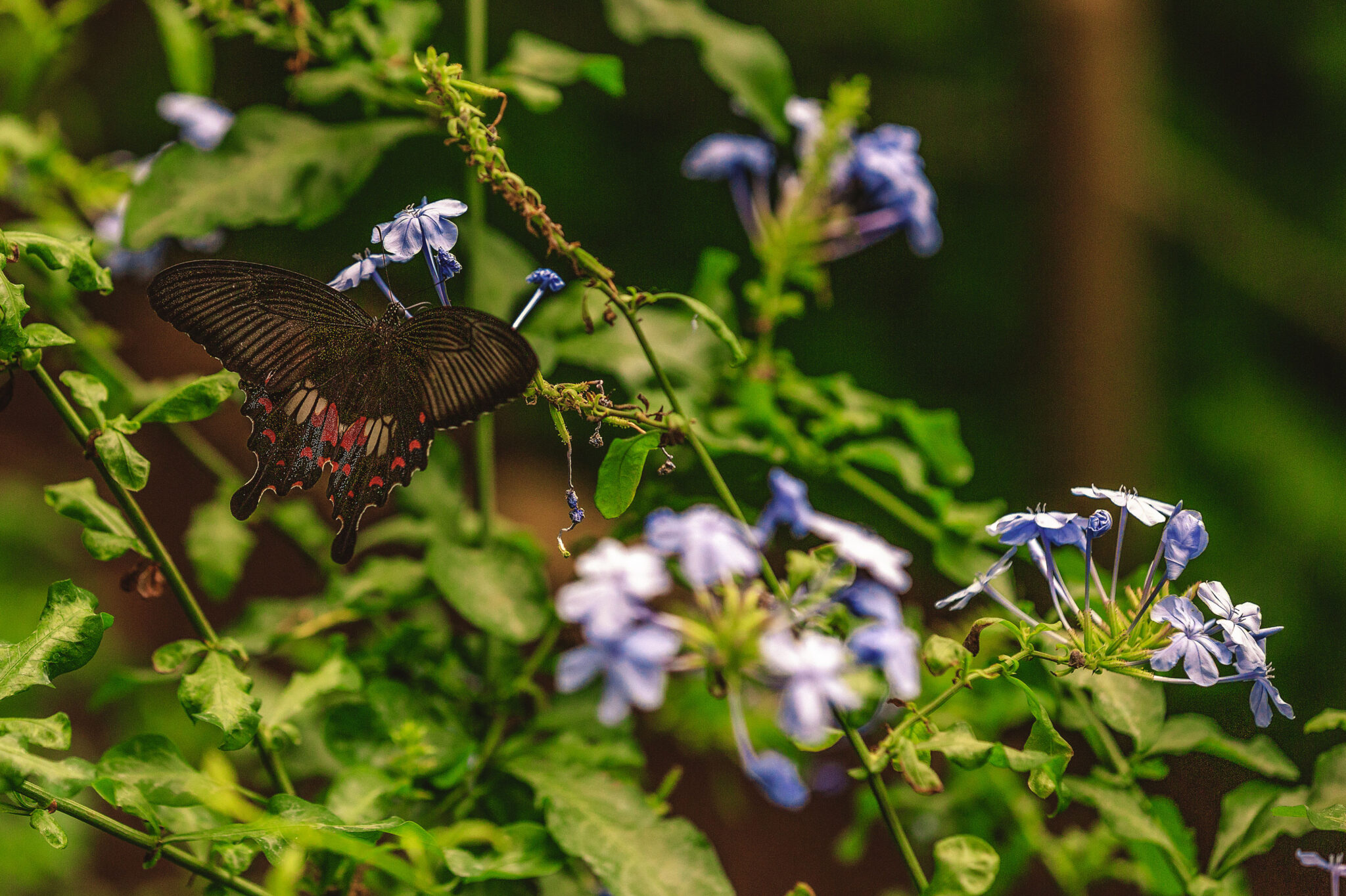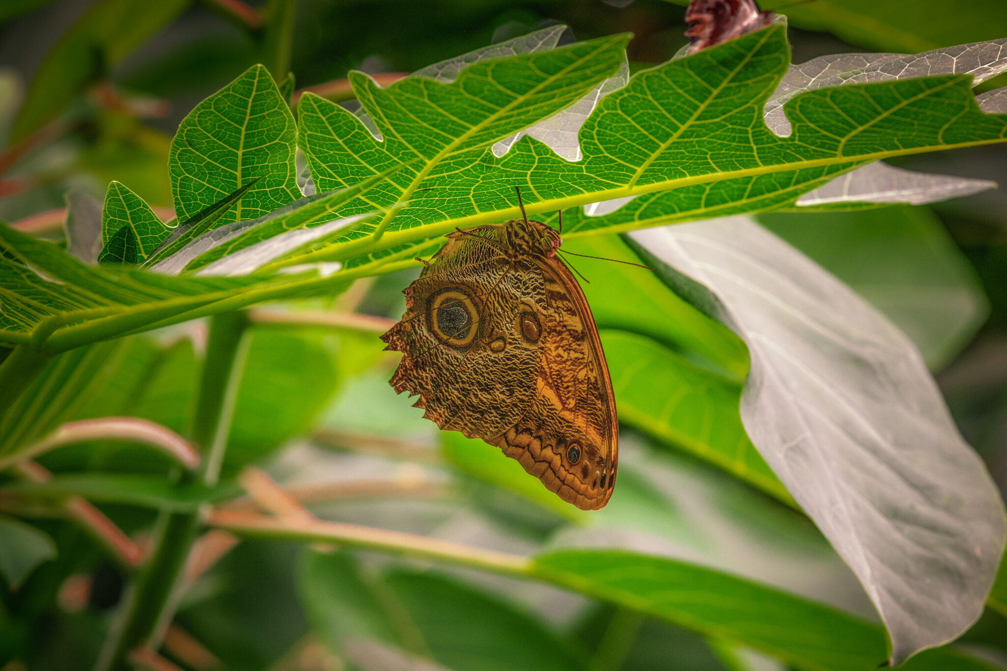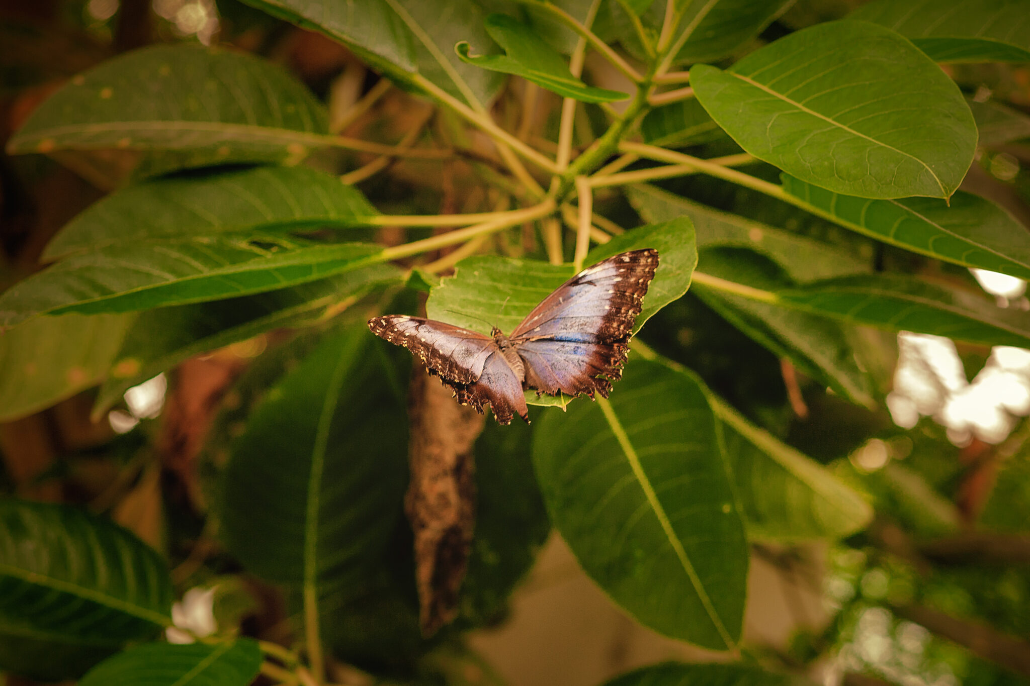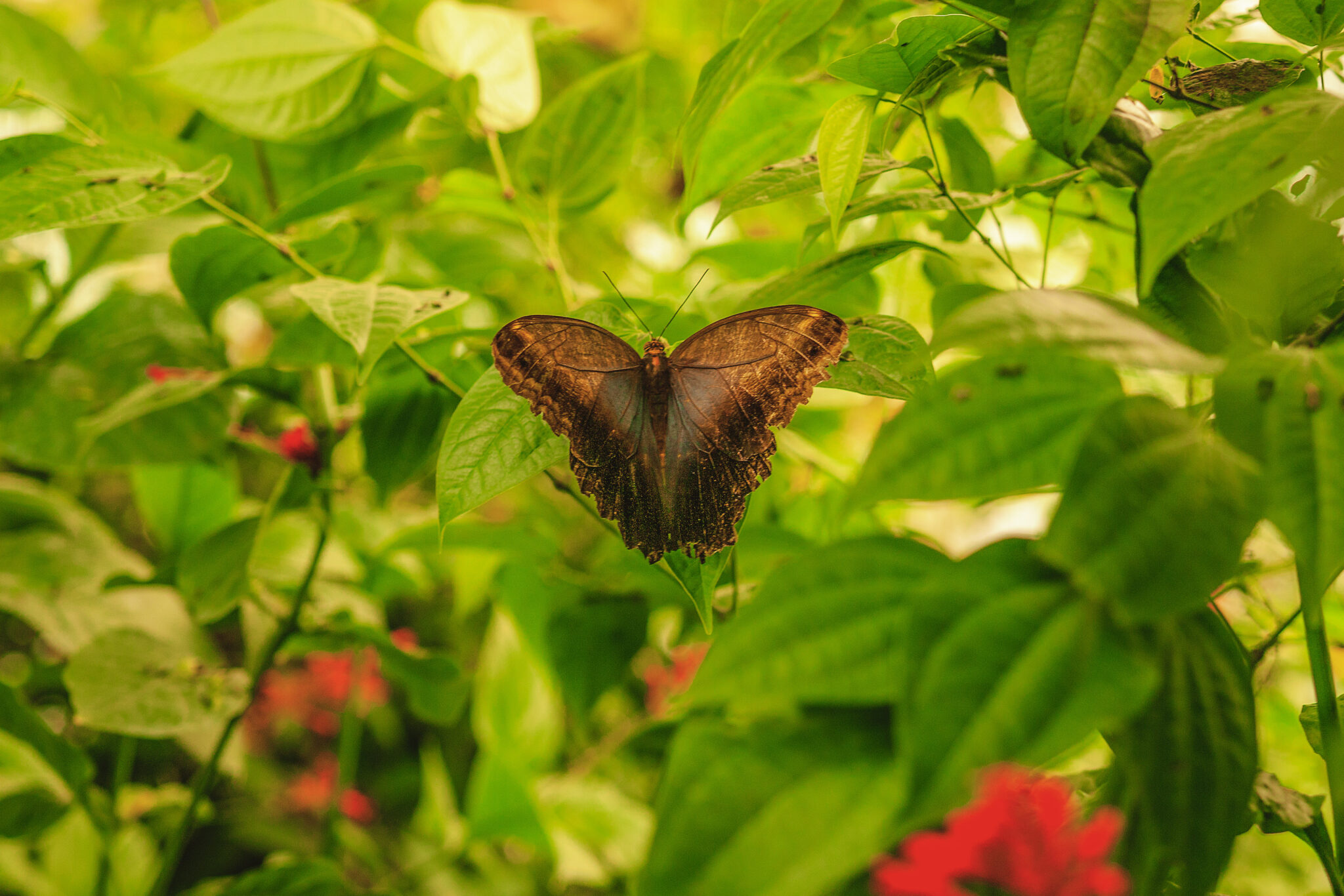 Die Schmetterlinge schwebten scheinbar schwerelos durch den Raum, ihre Flügel schimmerten im einfallenden Licht wie kleine Kunstwerke der Natur. Ich hatte Glück und konnte mehrere Arten ablichten. Auf einem grünen Blatt ruhte ein Eulenfalter, dessen charakteristische Augenzeichnung auf den Flügeln mich sofort faszinierte. Die Augen wirkten täuschend echt, als würde mich ein kleines Geschöpf direkt anstarren. Ein anderer brauner Schmetterling hatte sich im Laub niedergelassen und war aufgrund seiner Tarnfärbung nur schwer zu entdecken. Erst als er mit den Flügeln zuckte, erkannte ich ihn zwischen den vertrockneten Blättern. Auch ein exotischer, farbenprächtiger Falter mit leuchtenden Mustern ließ sich auf einem Blatt nieder und verharrte lange genug, um ein scharfes Bild zu ermöglichen. Seine Flügel schillerten in Rot-, Schwarz- und Weißtönen, ein Posthorn-Schmetterling mit seiner charakteristischen Zeichnung. Besonders beeindruckend war der Blaue Morphofalter, dessen schillernde Flügel im Sonnenlicht funkelten, oder der Passionsblumenfalter, der auch „Giftmischer” genannt wird, weil seine Raupen sich von giftigen Passionsblumen ernähren und dadurch selbst ungenießbar werden.