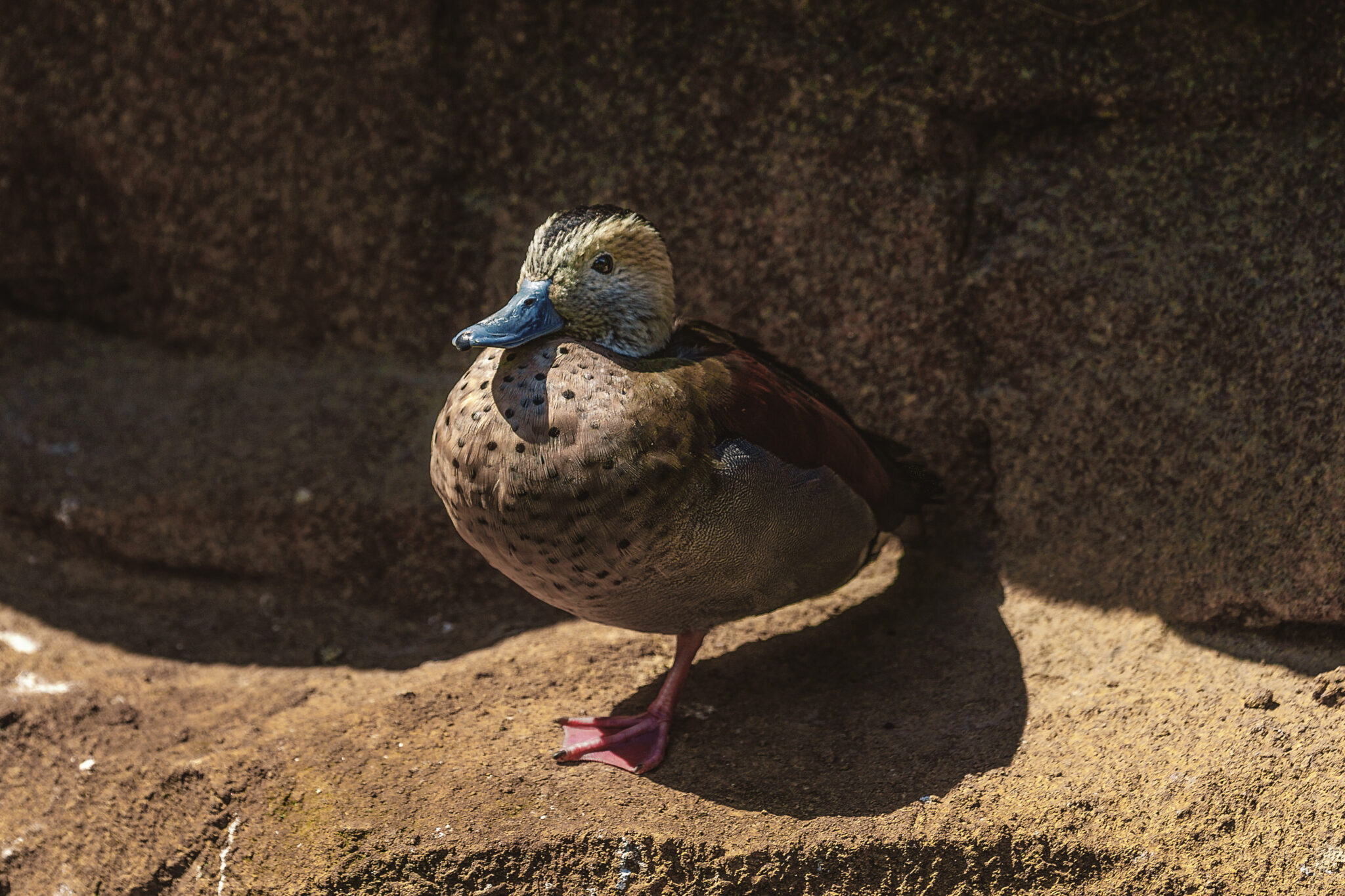 In der Nähe der Afrikawiese entdeckte ich eine Rotschulterente, die auf einem Felsen ruhte. Die kleine Ente hatte ihre Augen geschlossen und genoss offensichtlich die Wärme der Mittagssonne. Rotschulterenten sind kleine, zierliche Schwimmenten mit einer Körperlänge von 35 bis 38 Zentimetern und einem Gewicht von 190 bis 390 Gramm. Die Erpel sind farbenfroh gefärbt mit kastanienbraunen Flügeln, einem schwarzen Kopfband, hellgrauer Seite und hellrosa Brust mit schwarzen Punkten. Die Weibchen sind schlichter mit olivgrün bis bräunlichem Rücken und beiger Kopffärbung mit weißer Musterung. Diese Entenart stammt aus Südamerika, östlich der Anden, und bewohnt Teiche und Sümpfe in bewaldeter Landschaft. Im Krefelder Zoo werden Rotschulterenten im Pinguinpool gehalten, zusammen mit Humboldt-Pinguinen, Inkaseeschwalben und Zimtenten.