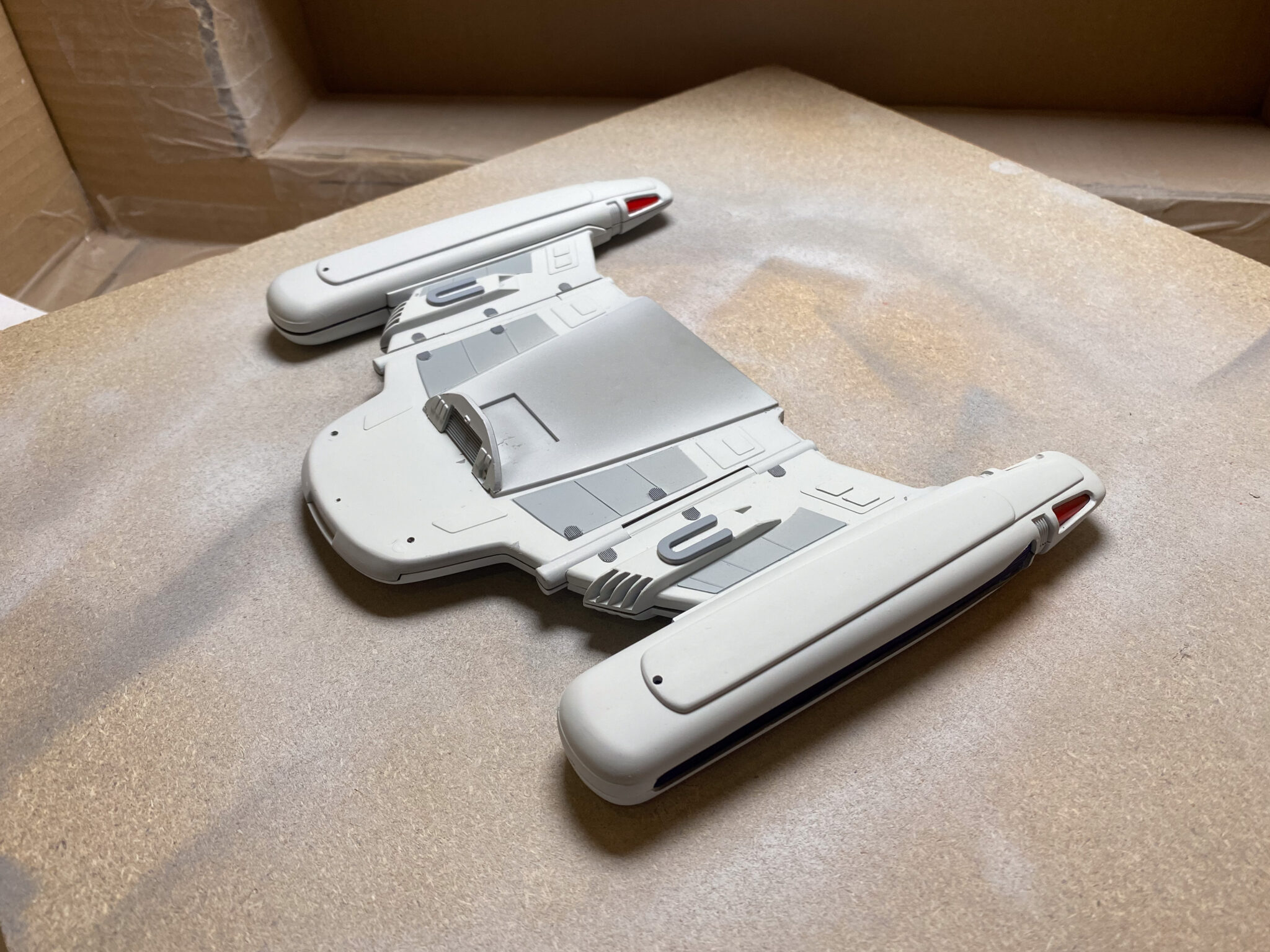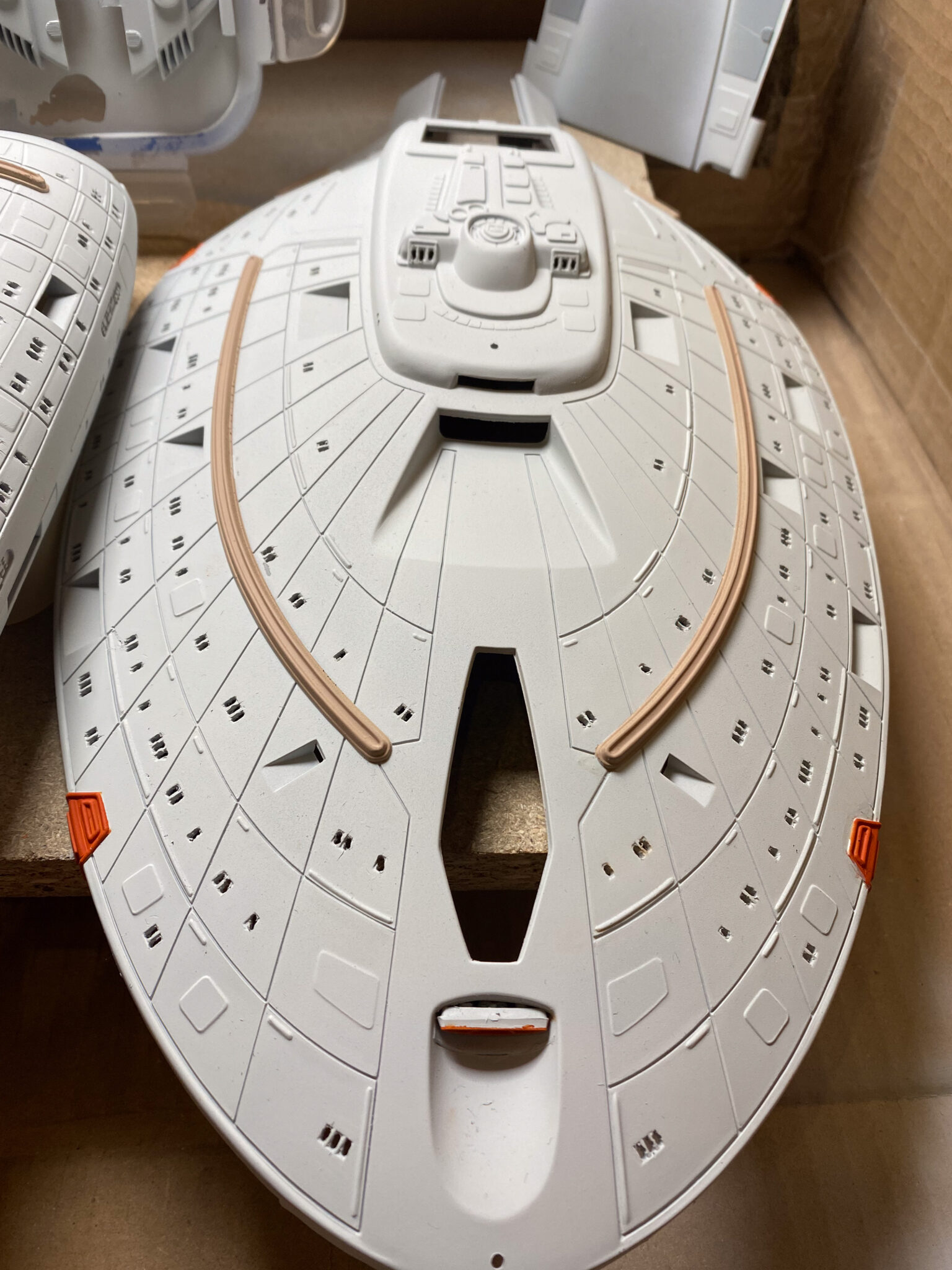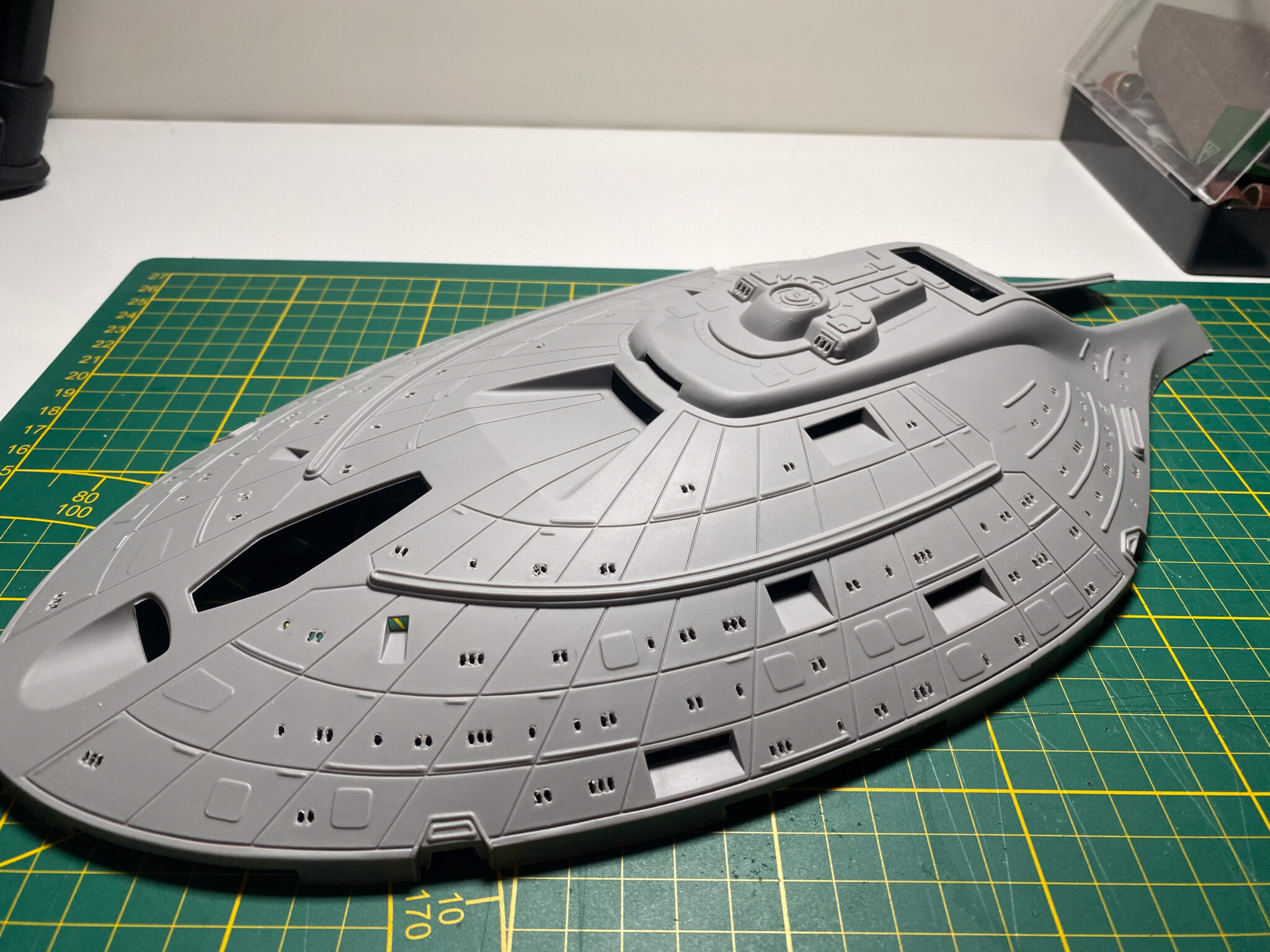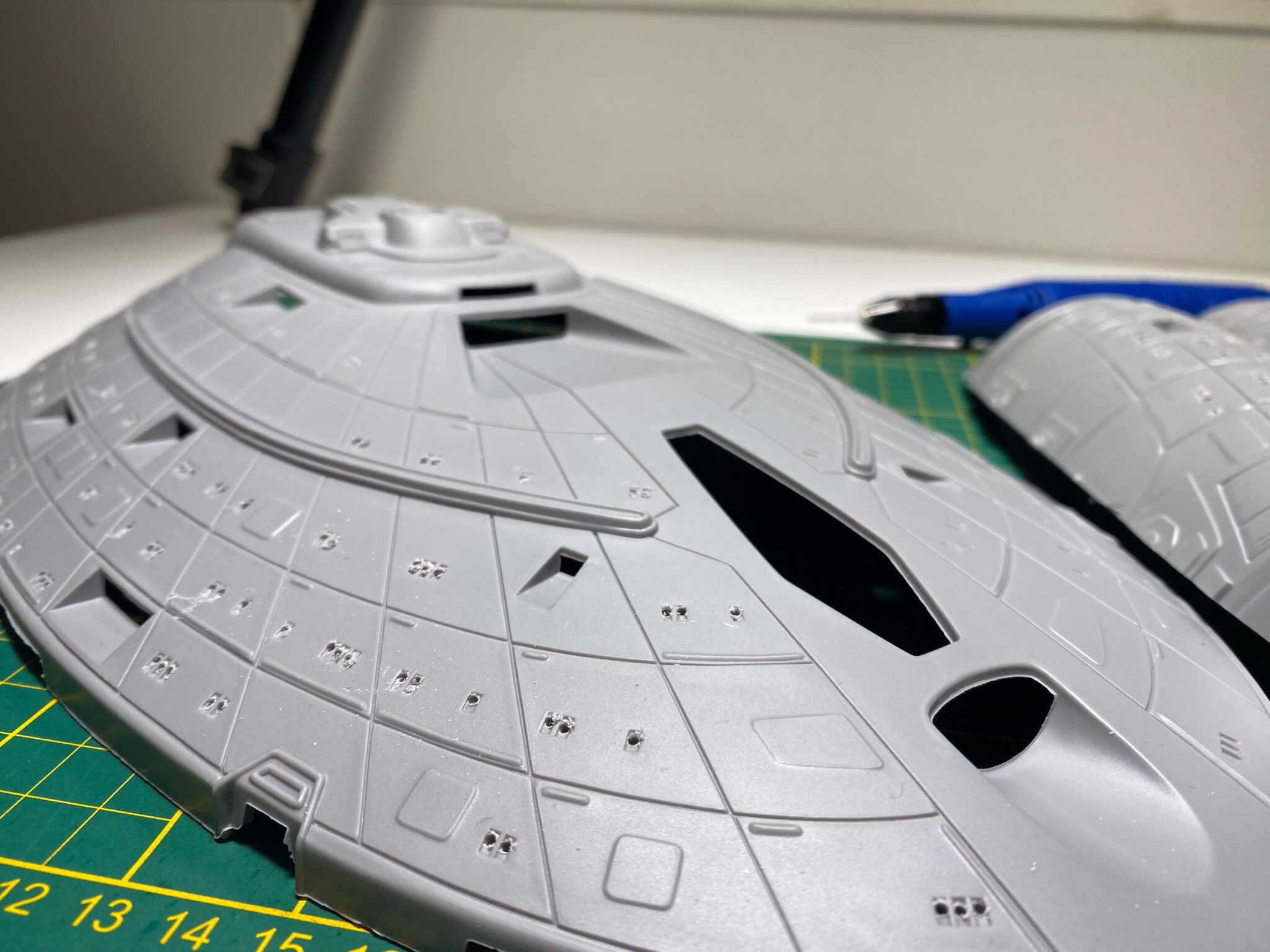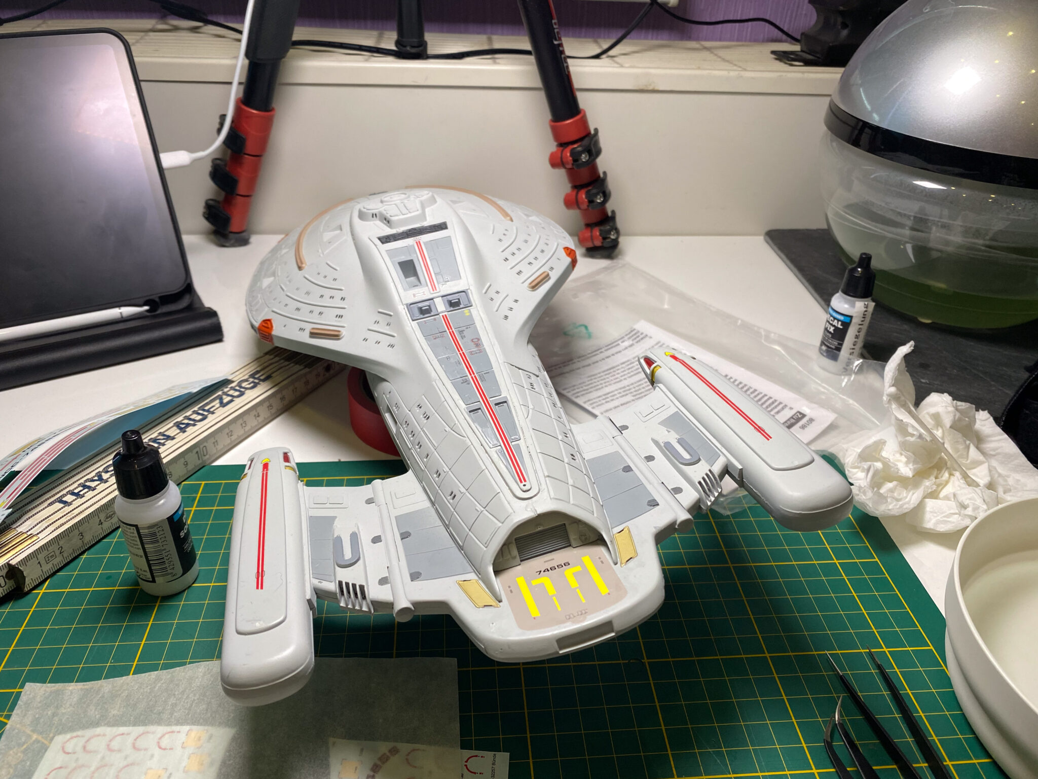 Wie bei vielen Modellbausätzen von Revell, gab es auch bei der U.S.S. Voyager einige Passungenauigkeiten. Insbesondere bei den schwenkbaren Pylonen und den Warpgondeln war ein hohes Maß an Präzision und Geduld erforderlich, um die Teile sauber zusammenzufügen. Hier halfen mir meine Erfahrung und ein wenig Kreativität: Mit Spachtelmasse und Schleifpapier konnte ich die Übergänge glätten und für eine nahtlose Optik sorgen. Diese Arbeitsschritte waren zwar zeitaufwendig, aber sie trugen wesentlich zum finalen Erscheinungsbild des Modells bei.